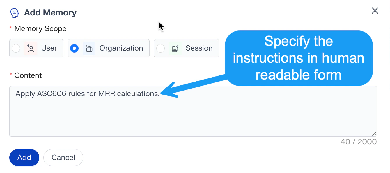 Memory is created automatically and assigned a low weight behind the scene from every analysis by the user and is classified as session, user or organization level memory automatically.Manually Creating Memory As Instructions for Aidnn