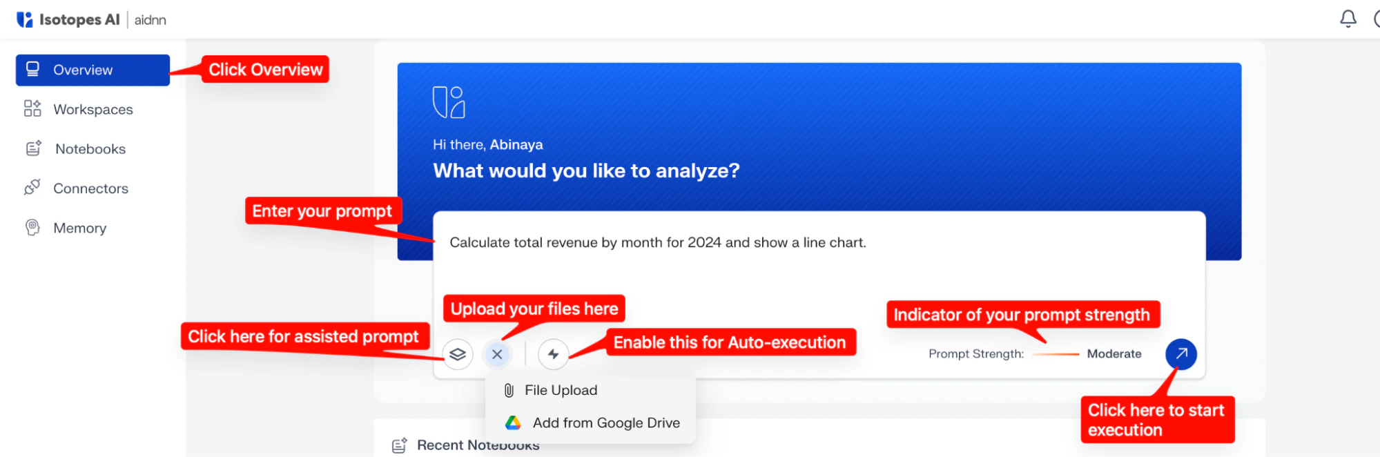 A notebook is created automatically as soon as you run an analysis. Here’s what each part of the screen helps you do:-