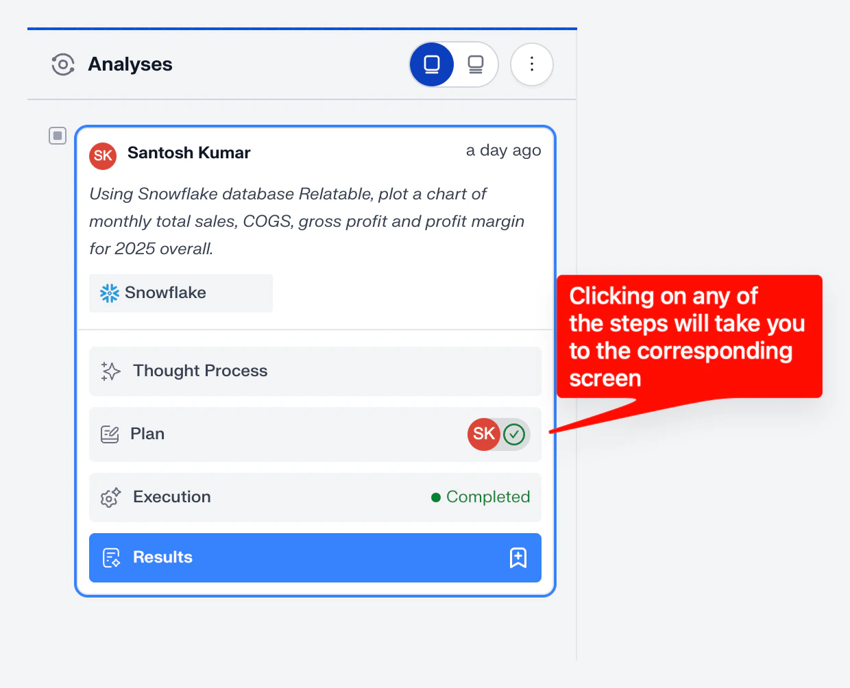 Clicking on any step on the left (Thought Process, Plan, Execution, Results) instantly takes you to that corresponding screen. This makes it easy to review the entire workflow and understand how Aidnn arrived at the final results.