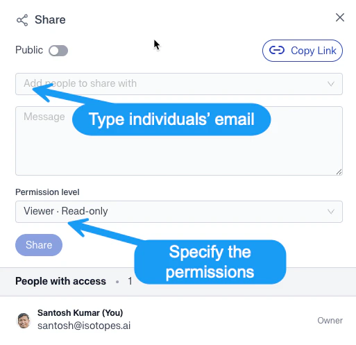 You can share your analysis with others who can view, review or even further continue your analysis. aidnn makes collaboration seamless and as effective as Google docs. To share your notebook, just click on the share button on the top right as shown below:\