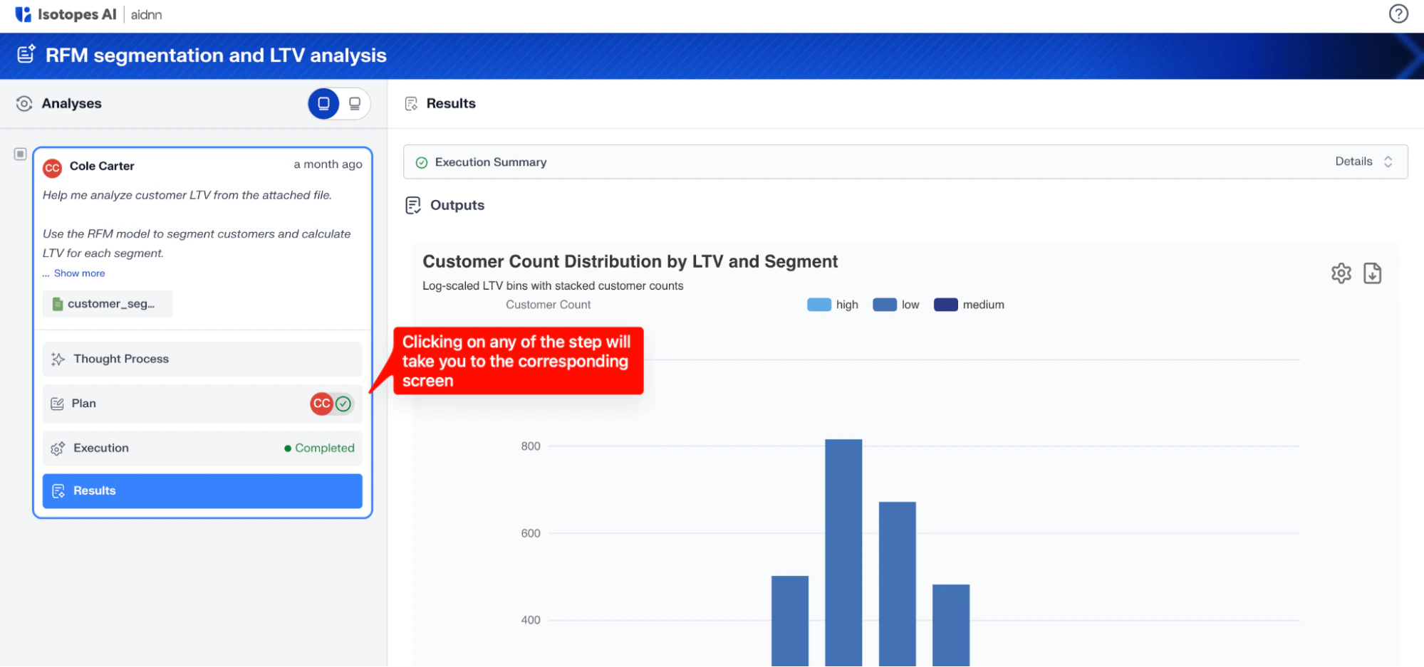 Your prompt is displayed on the left panel so you can always see the request you made. aidnn immediately starts with the Thought Process phase. In this stage, aidnn interprets your request, reviews your available data sources, identifies what inputs are needed, and determines the best analytical approach to fulfill your request. This phase is fully transparent, allowing you to see how aidnn understands your prompt. Once the Thought Process is complete, aidnn transitions into the Plan phase. Here, it presents a clear, step-by-step outline of the actions it will take such as loading datasets, cleaning data, performing calculations, and generating charts or tables.
